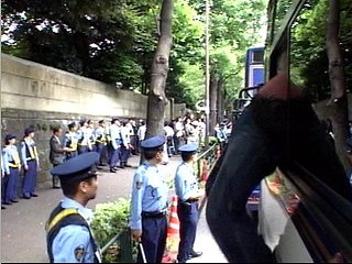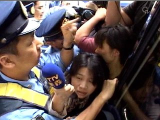 游覽車被現(xiàn)場日本的強勢警力包圍,有記者決定下車拍攝,不過就在下車瞬間,日本警察就一擁而上,女記者被推擠的像沙丁魚一樣,扭曲變形,日本警察就是不準臺灣媒體下車采訪,這時一位攝影記者只好跳車,但還是被日本警方再推回車上。