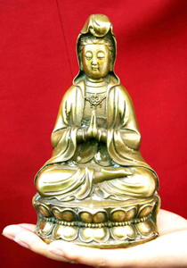 據(jù)收藏這尊佛像的丁先生介紹,這尊古佛像材料采用古銅精密鑄造,佛像高18.3厘米,直徑為10.2厘米,重0.83千克。佛像造型為觀音雙手合十,端坐在蓮花上,端莊而慈祥的面容,整體生動(dòng)流暢,服飾飛舞飄逸,將觀音的世俗化和個(gè)性化以及親和力表現(xiàn)得淋漓盡致。