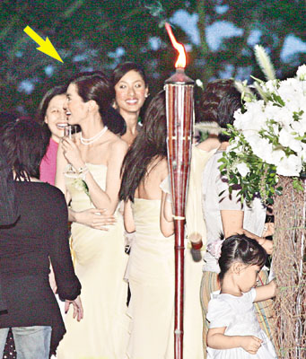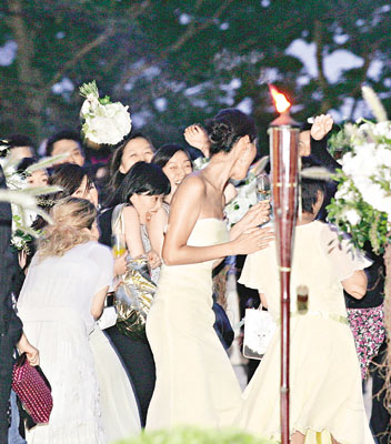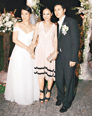 新娘子Stephanie平日為旗下藝人做慣幕后軍師,前晚輪到她當(dāng)主角,她喜孜孜地說:“婚宴請了二百五十人,擺了二十五桌,Gigi送手鐲、莫文蔚送耳環(huán)、蔣怡送飾物、楊采妮送的好有心思,但我不會講是什么。最開心天心都由臺灣來香港,楊采妮更陪我挑選結(jié)婚戒指,Gigi尋晚陪著我整晚,幫我想問題考新郎。拋花球時我想另外一個圈外人接到,又想天心接到,因?yàn)樗杏岩积R來。”
