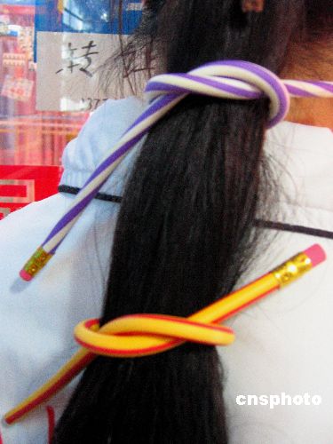 6月19日,在南京一家時(shí)尚用品商店里,一款名為“百變不斷”的新型鉛筆十分引人注目。據(jù)介紹,這種新型鉛筆采用國(guó)外最新工藝制作,筆長(zhǎng)約40厘米,筆芯使用效果相當(dāng)于2B的普通鉛筆。該鉛筆即可實(shí)用,也可作為裝飾,柔度很高,可以隨意彎曲打結(jié),還可扎在女孩的辮子上。作者:孫忠南
