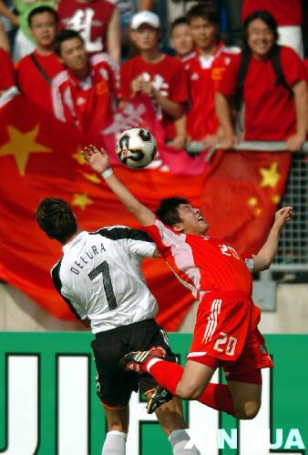 比賽開始后,中國青年隊一上來就打出了氣勢。第4分鐘,中國隊中場球員陳濤為中國隊贏得一個禁區(qū)前沿的任意球,他親自主罰,球越過了人墻后在門前反彈,德國門將來不及撲救球就彈入了大門,中國隊以1-0領(lǐng)先。