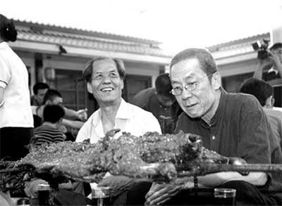 剛剛從延安回來(lái)的陳忠實(shí),帶著話(huà)劇版導(dǎo)演林兆華、主演濮存昕在白鹿原上轉(zhuǎn)悠了一天,據(jù)說(shuō)收獲不小。晚上,當(dāng)?shù)卮迕窠M織了對(duì)北京人藝一行的歡迎活動(dòng)。四方小凳、鐵皮桌、山野菜、架子上散發(fā)著香味的烤全羊,濃濃的鄉(xiāng)土氣息讓一路走來(lái)的濮存昕有些激動(dòng)。濮存昕很紳士,非要等到對(duì)面的陳忠實(shí)、林兆華落座后才緩緩坐下。