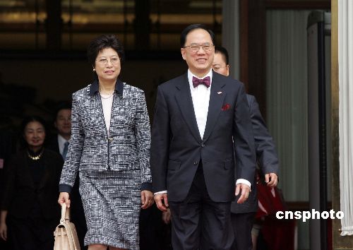 香港特區(qū)行政長官曾蔭權六月二十四日在北京人民大會堂香港廳宣誓就職。曾蔭權在完成就職宣誓儀式并與溫家寶總理會見后,喜氣洋洋走出人民大會堂。作者:毛建軍