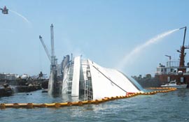 30日凌晨零時(shí)許,船體又見火舌,黑夜中大火吞噬船只,郵輪傾斜漸趨嚴(yán)重,凌晨4時(shí)30分左右燒得焦黑的煙囪撞擊在碼頭上,船身呈90度傾斜,右側(cè)整個(gè)坐在海床上。