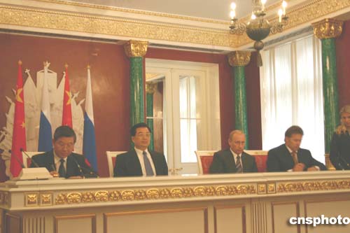 中國和俄羅斯企業(yè)界今天在此間簽署多項協(xié)議,涉及石油天然氣、電力以及金融等諸多領域。正在對俄羅斯進行國事訪問的中國國家主席胡錦濤與俄總統(tǒng)普京共同出席了簽字儀式。圖為中國石油天然氣集團公司總經(jīng)理陳耕與俄羅斯石油公司總裁波格丹諾夫簽署了《長期合作協(xié)議》。作者:齊彬
