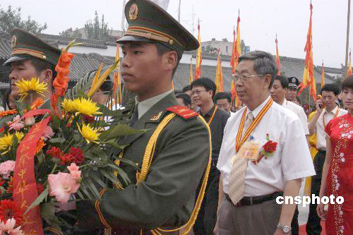 在古樂和廟內古箏的伴奏下,參祭隊伍按順序列隊,由禮儀人員引導,全國人大常委會副委員長許嘉璐,澳門基金會行政委員吳志良、臺灣時報周刊名譽董事長簡志信等參祭人士,在兩位武警禮兵的協(xié)助下,進入廟內敬獻花籃、行禮。