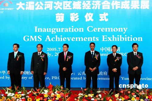 七月三日,大湄公河次區(qū)域經(jīng)濟(jì)合作(GMS)成果展在昆明國際會(huì)展中心開始展出。該展覽分為多元文化、傳統(tǒng)友誼、豐碩成果和美好前景四個(gè)部分,展現(xiàn)了有關(guān)各國開展合作以來取得的成績和美好前景。圖為柬、中、老、緬、泰、越官員在成果展剪彩儀式上。作者:納家驊
