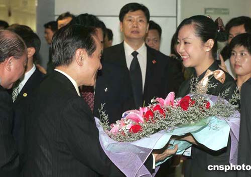 由臺灣新黨主席郁慕明率領(lǐng)的臺灣新黨紀(jì)念抗戰(zhàn)勝利六十周年大陸訪問團(tuán)七月六日下午抵達(dá)廣州新白云國際機(jī)場,受到熱情迎接。作者:毛建軍