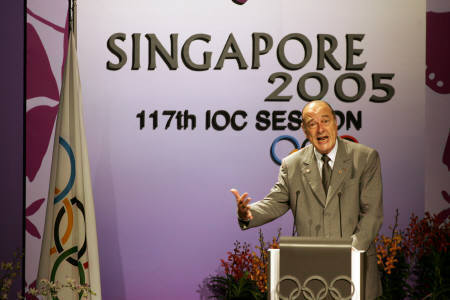 7月6日,法國總統(tǒng)希拉克親自在新加坡舉行的國際奧委會(huì)(IOC)第117屆大會(huì)中,為巴黎發(fā)表申奧陳述。巴黎、倫敦、紐約、馬德里和莫斯科共同角逐2012年夏季奧運(yùn)會(huì)主辦權(quán),IOC將在6日稍晚在新加坡投票選出主辦城市。圖據(jù)路透社