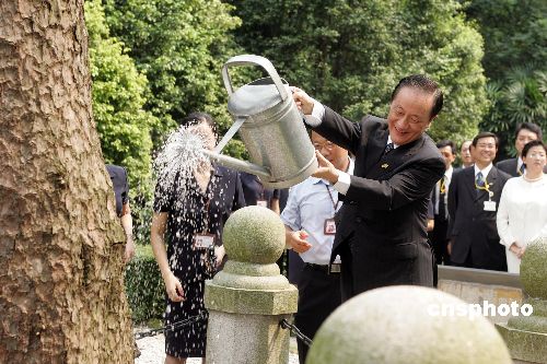 新黨主席郁慕明率領(lǐng)的新黨“民族之旅”訪問(wèn)團(tuán)七月七日拜謁廣州黃花崗七十二烈士陵園,并向一九一二年孫中山先生種下的馬尾松澆水培土。作者:毛建軍