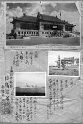 在一塊硬紙板上,這位日軍軍官特意將上海市市政府大樓被日軍轟炸前后作了比較。在被炸毀的上海市政府大樓照片中,還顯示出一塊寫有“上海神社建設(shè)地”的牌子。這幅照片的圖片說明注明當時日軍有在上海市府前建靖國神社的企圖。在同一紙板后面,所貼的照片顯示了當年上;疖囌颈徽У膽K狀。