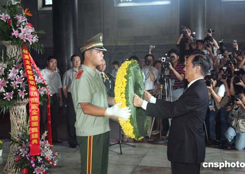 中新社南京七月八日電(記者陳光明丁梅趙海燕)“新黨紀念抗戰(zhàn)勝利六十周年大陸訪問團”今天早晨拜謁南京中山陵,全體團員每人手持一枝白色百合花,敬獻在孫中山先生的靈寢前。