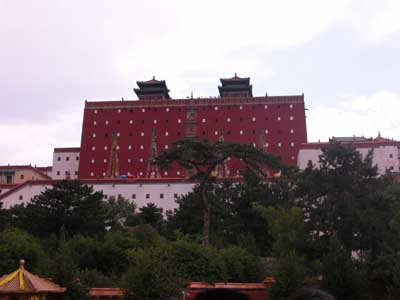 這座“小布達拉宮”始建1767年,歷經(jīng)4年竣工。它仿照了西藏布達拉宮“城”和山頂兩個部分,墻壁紅白相間,有藏式平頂?shù)锓俊⒉厥脚_塔、藏式殿堂等,但它又不僅是西藏布達拉宮的復制品,它在模仿中融合了漢族建筑傳統(tǒng),“漢藏合一式”的建筑特色在這棟占地22萬平方米的寺廟中隨處可見。