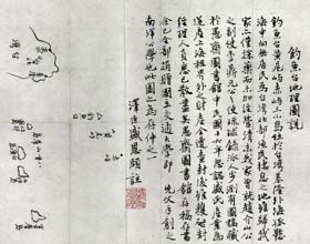 盛恩頤家書寫于1947年12月5日,信中寫道,“臺灣外海有三小島曰釣魚臺、黃尾嶼與赤嶼,皆無人荒島,見于出使琉球使者趙文楷介山公之記述!薄盎噬弦源巳龒u贈與汝祖,作為采藥之用,詔書猶在家中,并有圖說,茲寄汝望汝能設(shè)法前往一看,但如有危險則不可往!