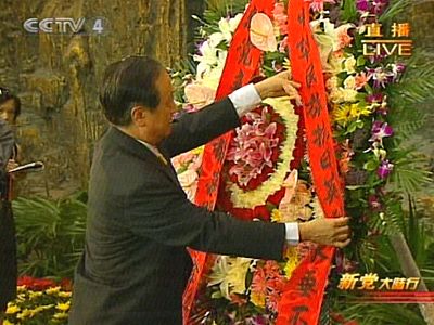 7月11日,新黨大陸訪問團(tuán)參觀抗日戰(zhàn)爭(zhēng)紀(jì)念館。圖為新黨主席郁慕明向抗戰(zhàn)紀(jì)念館敬獻(xiàn)花圈。(央視截圖)