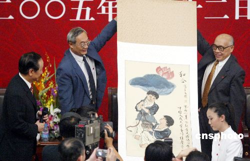 二、一幅名為“和合”的中國畫。“和合二仙”是中國民間傳說之神,有“和諧合好”,“婚姻和合”,“家人和合”等豐富含義,蘊(yùn)含著中國哲學(xué)的核心思想!昂秃稀边有“回家”之意,象征臺(tái)灣盡早回歸,實(shí)現(xiàn)統(tǒng)一。