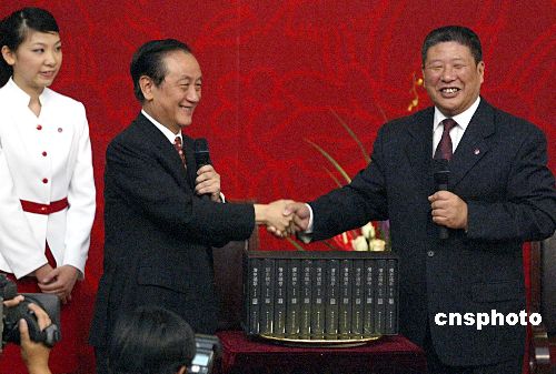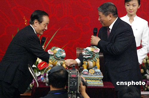 中新網(wǎng)7月12日電 今日(12日)上午在結(jié)束演講后,中國人民大學(xué)校長紀(jì)寶成等代表人大向新黨主席郁慕明贈(zèng)送了三件紀(jì)念品和禮品。