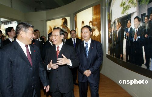 郁慕明在中國(guó)人民大學(xué)校長(zhǎng)紀(jì)寶成(左)的陪同下,參觀該校校史展。作者:史利