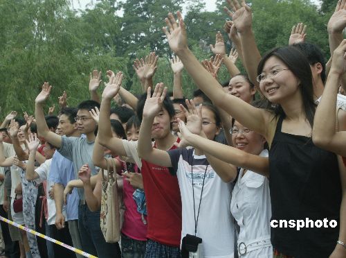 中國(guó)人民大學(xué)師生們?cè)谛@歡迎臺(tái)灣新黨主席郁慕明率領(lǐng)的大陸訪問(wèn)團(tuán)來(lái)訪。作者:史利