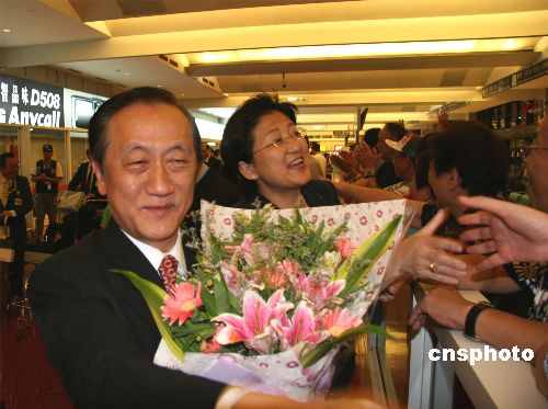 新黨主席郁慕明結(jié)束在大陸八天的“民族之旅”,七月十三日晚間十點(diǎn)左右抵達(dá)臺(tái)北,在機(jī)場(chǎng)受到支持群眾的歡迎。作者:路梅