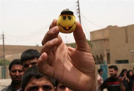 中新網(wǎng)7月13日電 據(jù)美聯(lián)社報道,7月13日,當(dāng)美軍向兒童分發(fā)糖果時,遭到自殺汽車炸彈襲擊。襲擊造成了至少27人死亡,美國和伊拉克官員稱。一名美軍士兵和大約12名伊拉克兒童喪生。圖為伊拉克兒童在展示美軍贈送的玩具。(春風(fēng))