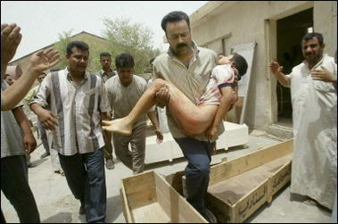 中新網(wǎng)7月14日電 據(jù)法新社報道,一名自殺式汽車爆炸襲擊者七月十三日在美軍士兵向伊拉克兒童發(fā)放巧克力時發(fā)動了襲擊,爆炸造成二十四名伊拉克兒童喪生。圖為在巴格達一家醫(yī)院太平間外扛著兄弟尸體的伊拉克人。(春風(fēng))
