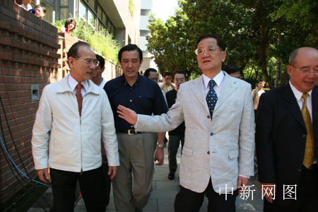 7月16日,中國(guó)國(guó)民黨主席選舉在全臺(tái)601個(gè)投票所展開,F(xiàn)任國(guó)民黨主席在居家附近的臺(tái)北復(fù)興中小學(xué)參加投票。圖為連戰(zhàn)(右二)在步入學(xué)校前,與國(guó)民黨秘書長(zhǎng)林豐正(左一)交談臺(tái)灣農(nóng)產(chǎn)品登陸問題,1號(hào)參選人、臺(tái)北市長(zhǎng)馬英九(中)和國(guó)民黨副主席吳伯雄(右一)陪同。中新社記者 董會(huì)峰