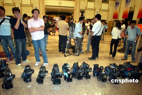 七月十六日晚,中國國民黨主席選舉揭曉,臺北市長馬英九高票當(dāng)選。圖為眾多媒體在臺北國民黨中央黨部等待新主席露面。作者:盛佳鵬