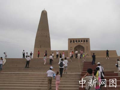 塔下的清真寺是一個大型清真寺,寬敞宏大。這是一個很有地方特色的建筑物。它有可容千人以上的禮拜大廳、穹形的拱頂,造型美觀的馬蹄形券頂,眾多的壁龕,幽暗的布道小室,處處都顯示著伊斯蘭建筑的風格和濃烈的宗教生活氣息。它們都是用陰干的生土坯建筑起來的。以陰干生土坯砌墻蓋頂,建屋造房,這在干燥少雨的吐魯番地區(qū)是十分普通而且有悠久歷史的建筑方法。保存至今的交河、高昌故城,隨處可見這種土坯建筑物。(摘自天山網(wǎng))