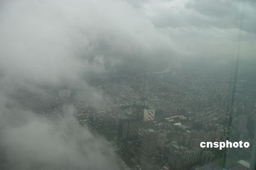 七月十九日,強臺風(fēng)“海棠”的中心離開臺島,臺北市依然雨勢不停。圖為在臺北101大樓八十九層觀景臺(三百八十米高)拍攝到的臺北市容,陰云依舊籠罩臺北,能見度甚低。作者:董會峰