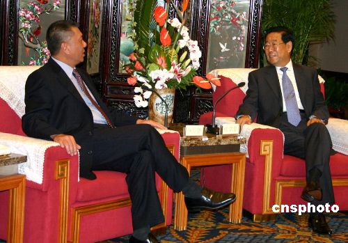 7月24日下午,澳門特首何厚鏵率團(tuán)來到成都,將出席25日開幕的第二屆“泛珠三角區(qū)域合作與發(fā)展論壇”。中共四川省委書記張學(xué)忠(右)會見了何厚鏵一行。作者:楊杰