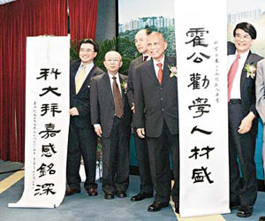為答謝霍英東的捐贈,科大今日贈送一副對聯(lián)予霍英東,內(nèi)容為“霍公勸學(xué)人材盛,科大拜嘉感銘深”。朱經(jīng)武說,稍后會與科大師生、校友及董事會商討正式報(bào)答霍英東的形式,不排除采用冠名的方法。完