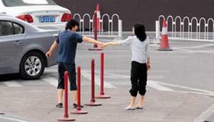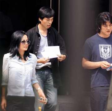 王菲扎著馬尾,穿一件黑色T恤和一條時(shí)尚的乞丐牛仔褲,戴一副超大號(hào)的黑色墨鏡,李亞鵬穿米黃色短袖襯衣、休閑褲。從兩人下車一直到在結(jié)婚登記處辦完手續(xù),李亞偉不離左右,而穿淺藍(lán)色T恤的男士則用DV機(jī)進(jìn)行跟拍。