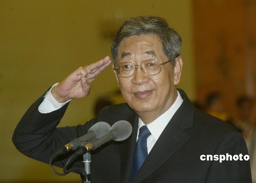七月二十九日,中國(guó)全國(guó)人大常委會(huì)副委員長(zhǎng)許嘉璐在北京人民大會(huì)堂向港澳同親同根萬(wàn)里行交流團(tuán)全體成員敬禮。作者:史利