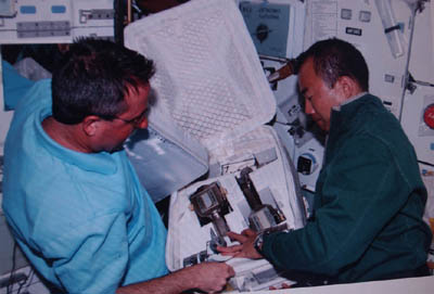 航天飛機和空間站的成員們今天早上開始,從附在聯(lián)合艙上的多功能后勤艙卸下裝備和物資。