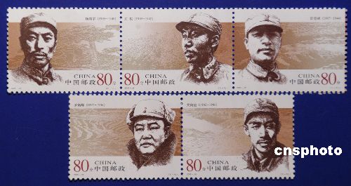 中國國家郵政局定于八月一日發(fā)行《人民軍隊早期將領(lǐng)》紀(jì)念郵票(一套五枚),特五枚郵票名稱分別為:楊靖宇(上排左一)、左權(quán)(上排左二)、彭雪楓(上排左三)、羅炳輝(下排左一)、關(guān)向應(yīng)(下排左二),面值均為八十分。作者:鄒憲