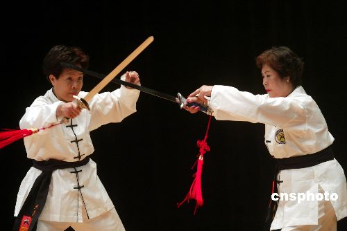 七月三十一日,全臺太極拳名師觀摩會在臺北舉行,各路太極拳以及太極劍、太極刀等多種武藝亮相舞臺。圖為太極劍表演。作者:盛佳鵬
