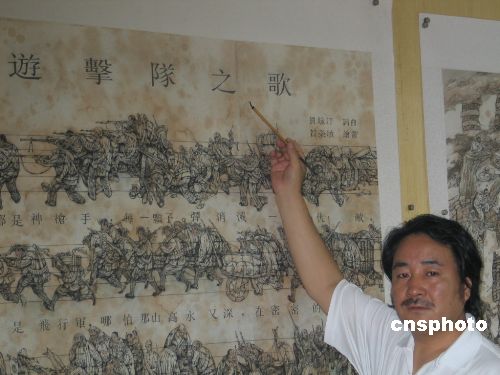 為紀(jì)念抗戰(zhàn)勝利六十周年,西安畫家賀榮敏用畫筆“畫”出《游擊隊之歌》。整幅畫卷以五線樂譜為基本構(gòu)圖,保留了樂譜線和歌詞,跳動的音符轉(zhuǎn)化為游擊隊員戰(zhàn)斗的身影。作者:冽瑋