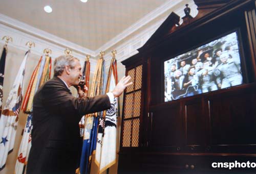 美國(guó)總統(tǒng)布什在白宮辦公室給太空中的發(fā)現(xiàn)號(hào)航天飛機(jī)機(jī)組打慰問(wèn)電話。作者:賈國(guó)榮