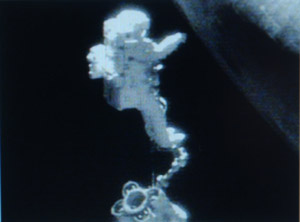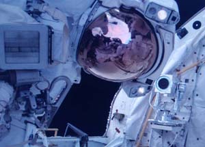 史蒂芬·羅賓遜在空間站機(jī)械臂協(xié)助下到達(dá)發(fā)現(xiàn)號(hào)前腹部,作了約五十分鐘的“太空外科手術(shù)”,順利清除隔熱瓷片縫隙凸起的填充材料。