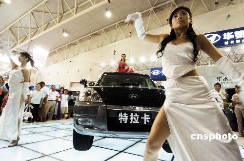 第四屆長(zhǎng)春國際汽車博覽會(huì)八月五日正式開展。各汽車廠商為吸引關(guān)注,均大打香車美女牌。作者:吳兆飛