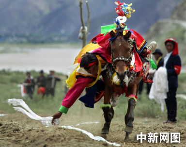 8月7日,西藏牧民在靠進(jìn)拉薩的薩拉鎮(zhèn)(Tsara)騎術(shù)比賽上撿起白色的哈達(dá),展示騎術(shù)。每年豐收時節(jié),牧民們會聚集在一起,展示他們的騎術(shù)。