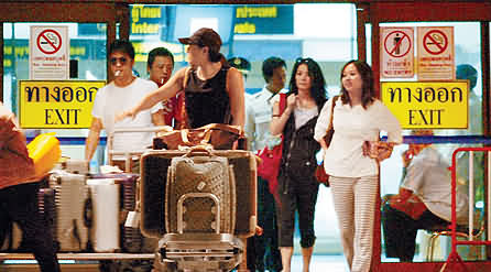 現(xiàn)場(chǎng)所見(jiàn),王菲邊走邊把墨鏡移到頭上,神情疲累,一步出機(jī)場(chǎng)大門已急不及待煲煙提神,至于表情輕松的李亞鵬則全程戴上太陽(yáng)眼鏡,同樣點(diǎn)起香煙抽起來(lái),然后二人便站在街上等候尾隨友人推出行李車,其間王菲難掩倦意,頻頻打呵欠。眾人其后登上早已在場(chǎng)等候的車子,行李則存放在另一小型貨車上,一切打點(diǎn)妥當(dāng)后,司機(jī)便駕車直駛Banyan Tree五星級(jí)酒店。
