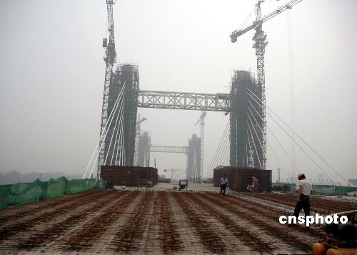 受石家莊市市民關(guān)注的槐安路大橋近日將實現(xiàn)東西兩側(cè)的邊跨合龍,8月11日,正在按計劃推進“大合龍”的前期準備。石家莊市槐安路大橋是該市道路交通設(shè)施改造的重點工程,是該市第一座高架斜拉橋。作者:林風風