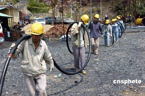十一日,廣東興寧大興透水煤礦再加裝從河南省調(diào)來的九百千瓦大功率潛水泵,以加快井下排水進(jìn)度。圖為搶險(xiǎn)人員在為大功率水泵鋪設(shè)電纜。作者:羅仰明