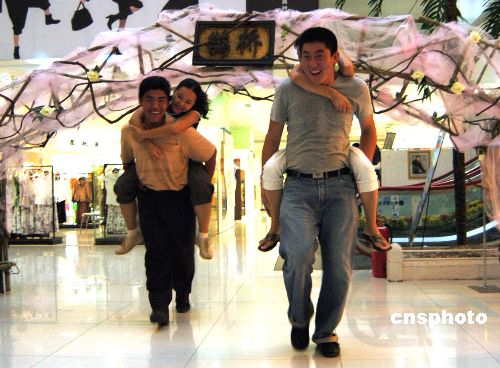8月11日是“七七情人節(jié)”,在山東濰坊世紀(jì)泰華購物廣場,兩對情侶正在參加背妻比賽。近幾年來,“七七情人節(jié)”受到了越來越多的年輕人的喜愛。許多商家也抓住這一商機(jī),舉辦活動吸引人氣,進(jìn)行促銷。作者:王志德