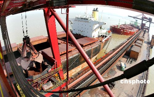 2005年8月11日,據(jù)商務部新聞辦公室披露,今年上半年,我國鐵礦石進口1.3億噸,同比增長34.5%,增幅比上年同期回落6個百分點。今年國家出臺有關宏觀調(diào)控措施,加強了鐵礦石進口協(xié)調(diào),規(guī)范了市場秩序,成效顯著,鐵礦石進口達到了預期調(diào)控目標。今年我國鐵礦石進口增幅將大幅回落。圖為二艘外國礦砂船正在我國港口卸礦砂。作者:張和平
