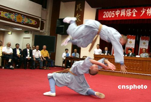 十二日下午,主辦單位中華少林協(xié)會在“立法院”群賢樓舉行“二00五中興保全少林禪武觀摩”記者會。眾武僧齊亮相,并表演了少林八段錦、猴拳、虎拳、蛤蟆拳、醉拳、三人對練、集體通臂拳等,技驚四座,贏得陣陣掌聲。