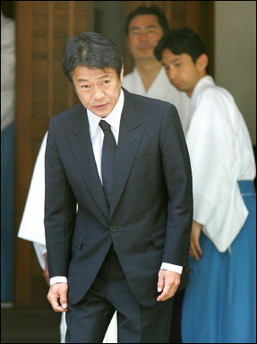 據(jù)香港媒體引述報(bào)道,在日本戰(zhàn)敗紀(jì)念日60周年前夕,中川昭一今日身穿黑色衣服,乘座駕抵達(dá)靖國(guó)神社參拜。他早前曾經(jīng)表示,參拜靖國(guó)神社是為了“祈求和平和誓言永不啟戰(zhàn)”。