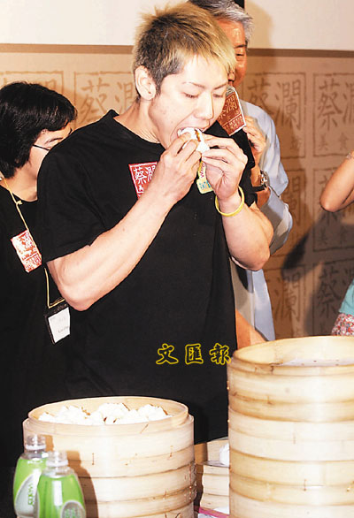 一身T恤和短褲打扮的小林尊昨午在“大食一番爭霸戰(zhàn)”決賽上,氣定神閑地上場,面對主辦方準備的叉燒包,面無懼色,不慌不忙的開始競食。只見他先將叉燒包掰成兩半,把包子在兩手中稍微捏小一點,便送入口,再喝一口水,頸一仰、頭一低,幾秒鐘內一個叉燒包就吞入肚。